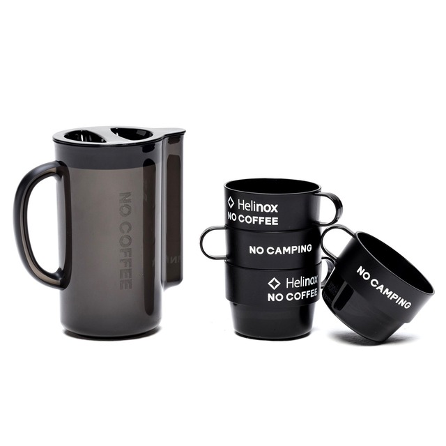 NO COFFEE × HELINOX NO COFFEE 10th Anniversary Project 韓国発のアウトドアブランド、Helinoxとのコラボレーション。 ”NO CAMPING”をキーワードに、アイテムを製作しました。 アウトドア、室内でも使用できる4個セットのポリプロピレン素材のマグカップ。 ◼️素材 : ポリプロピレン (PP) ◼️総重量 : 210 g ◼️サイズ : マグ 200ml × 4 : W10.15 x H6.08 x D8.06cm 重量 : 各 29 g / 合計 116 g ポット 800ml : W14.95 x H16.5 x D8.54 cm 重量 : 94 g 生産国 : 中国 <Helinoxとは> Helinox( ヘリノックス )は高強度、軽さ、驚異的な携帯性を兼ね備えた革新的なチェア等の製品をデザインしているブランドです。どこへでも持ち運びができる軽量さと1日中使用できる快適さを合わせ持ち、その優れたデザイン性でアウトドアファニチャーの進化をリードし続けています。