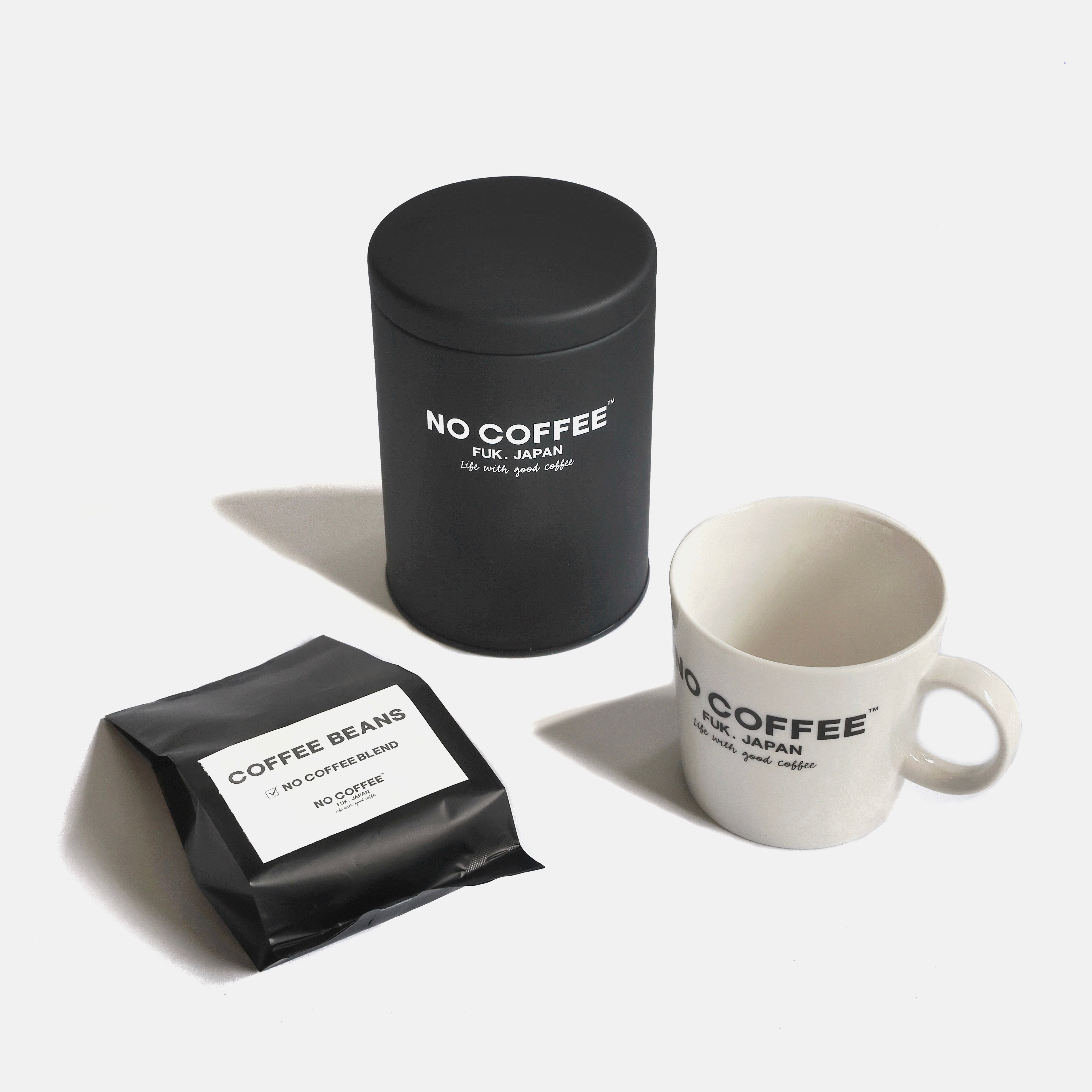自宅でのコーヒー豆の保存缶と定番人気のNO COFFEEオリジナルマグカップ。シンプルでどんなインテリアにも馴染みやすい飽きのこないデザインなので長くご愛用いただけます。